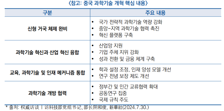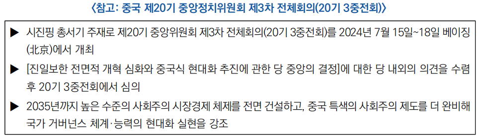 ▷ 이에 대해 제20기 당 중앙위원회 제3차 전체회의(24.7월)는 "전면적인 혁신을 지원하는 체제 메커니즘 구축"을 강조하여 당 중앙이 과학기술 혁신에 대해 얼마나 중시하고 있는지를 발표