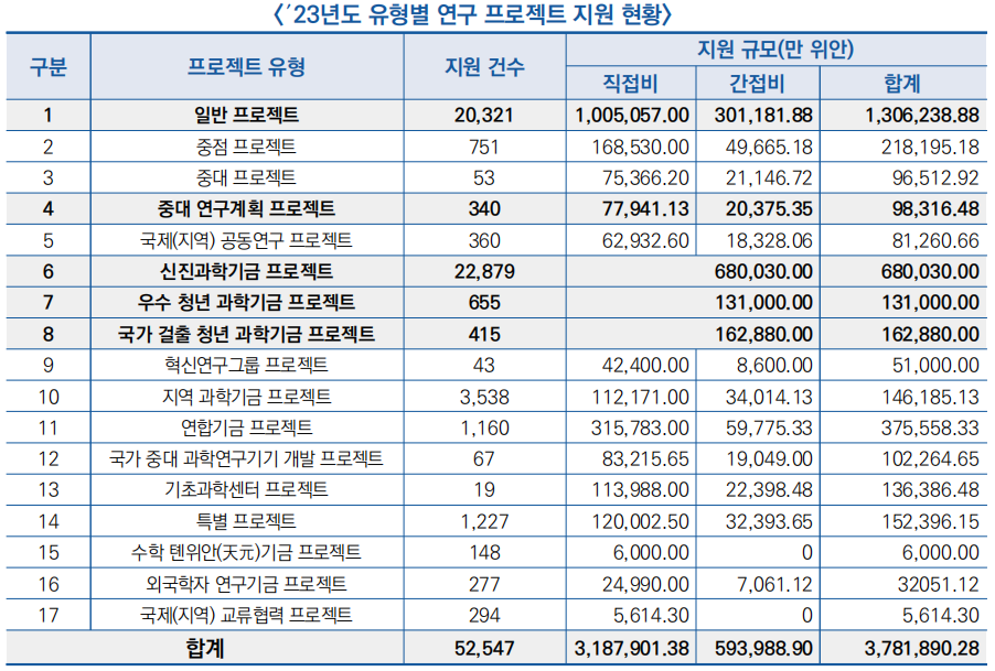- ′23년 신진 과학기금 프로젝트 지원 건수는 22,879건, 예산 규모는 68억 위안에 달함