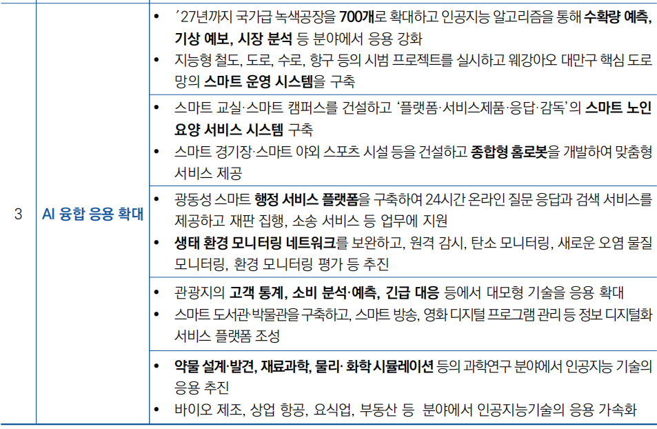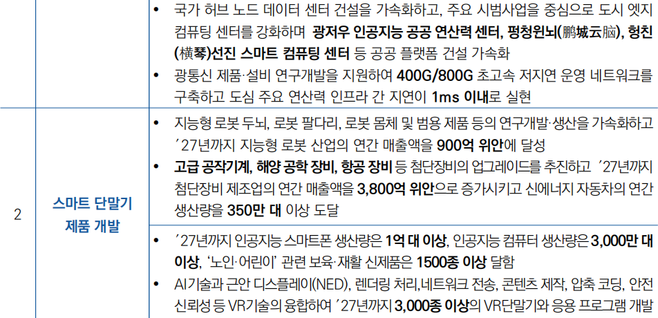 - ′27년까지 컴퓨팅 규모 60EFLOPS를 초과하고 핸드폰, 컴퓨터, 가전, 로봇 등 8대 분야에서 100개 종류 이상의 스마트 단말기를 개발하고 인공지능 핵심산업 규모를 4,400억 위안(83조 8,904억 원)이상으로 확대