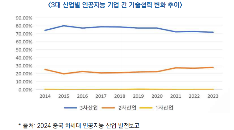 ![]() ○ 인공지능 기업 간 기술 협력 관계를 보면, 3차 산업이 71.93%로 1위를 차지하고, 2차 산업은 27.92%로 2위, 1차 산업은 0.15%로 3위 차지