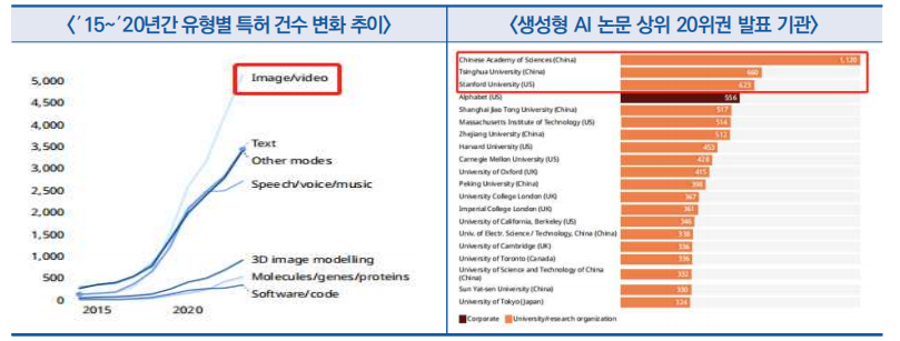 - 특허 기반이 되는 논문 건수는 ′14년의 116편에서 ′23년에 3만 4,000건을 초과, 특히 중국과학원이 총 1,120건을 발표해 세계 1위를 차지하고, 칭화대와 스탠포드대가 2~3위 차지