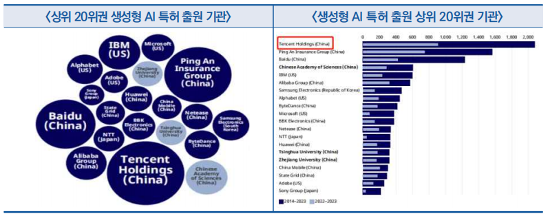 - 핑안(平安)보험(1,564건), 바이두(1,234건), 중국과학원(607건)이 2~4위를 차지하고, 알리바바(571건)와 바이트댄스(418건)는 6위와 9위를 각각 차지