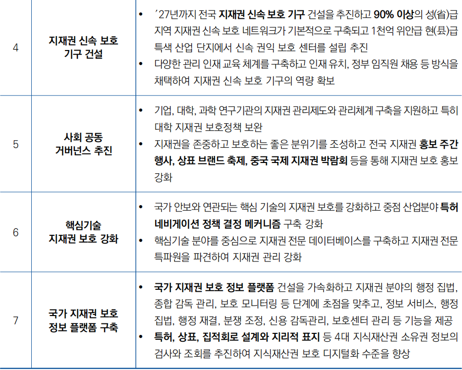 - ′27년까지 지재권 체계 및 보호 역량 현대화를 위한 지재권 관련 법률·법규를 체계화할 계획