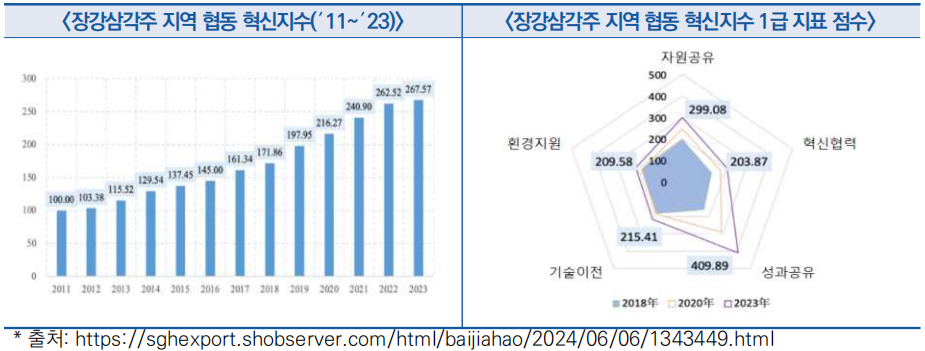 ○ 장강삼각주 지역 협동 혁신지수는 ′11년 100점에서 ′23년 267.57점으로 상승하였고, 연평균 성장률 8.55% 기록