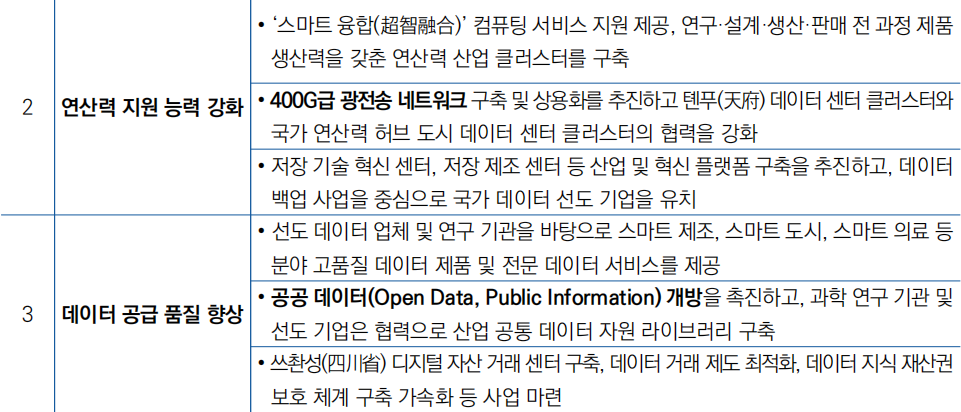 - ′21년 2월, 공업신식화부는 국가급 인공지능 혁신 응용 선도구 5개 도시( 베이징, 텐진, 항저우, 광저우, 청두)를 발표, 쓰촨성 청두시는 서부지방에서 유일하게 선정된 지역임