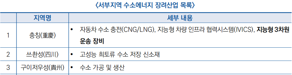 ○ 국가발전개혁위는 서부 특색산업과 신흥산업을 육성하기 위해 ‘서부지역 장려 산업 목록(의견 수렴안)’을 발표하였으며, 이중에는 수소에너지 산업을 신규로 추가함