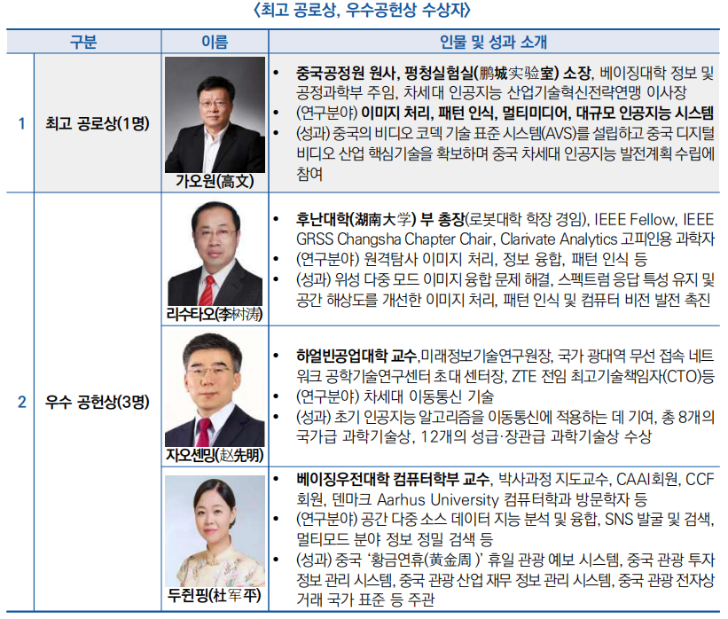 □ 중국 인공지능(AI) 분야의 발전과 산업화에 기여한 70개 프로젝트 및 개인 수상자를 발표(4.15)