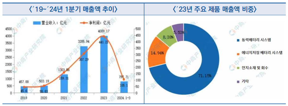 - 주 업무는 동력·에너지저장 배터리 및 배터리 회수·이용 제품의 R&D, 생산, 판매 및 AS 등이고, ′23년도에 주요 제품인 동력 배터리 시스템의 매출액은 전체의 71.15%를 차지