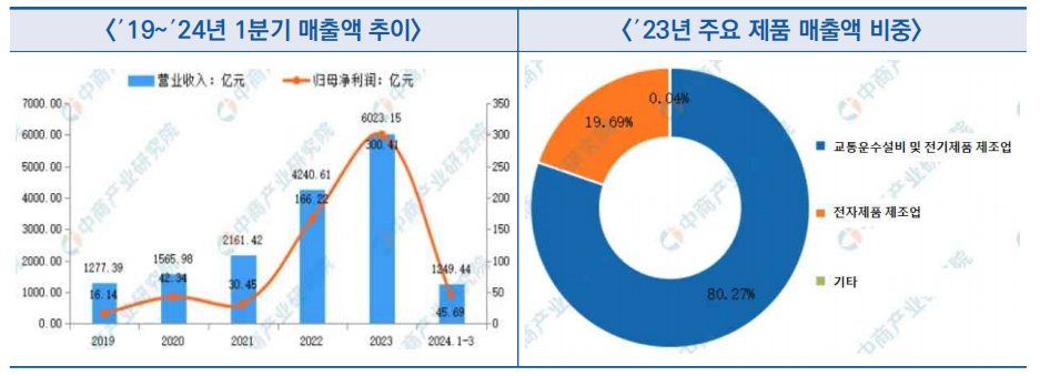 - 주업무는 신에너지자동차, 핸드폰 부품 및 조립, 2차 충전 배터리 및 광전지 등이고, ′23년도 교통운수설비 및 전기제품 제조업 분야 매출액이 전체의 80.27%를 차지