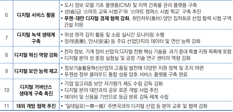 ○ 푸젠성 정부는 ‘디지털 중국 건설 총체 계획’을 이행하고 디지털 정부, 디지털 경제 발전 추진하기 위해 ′24년도 핵심 업무를 제시