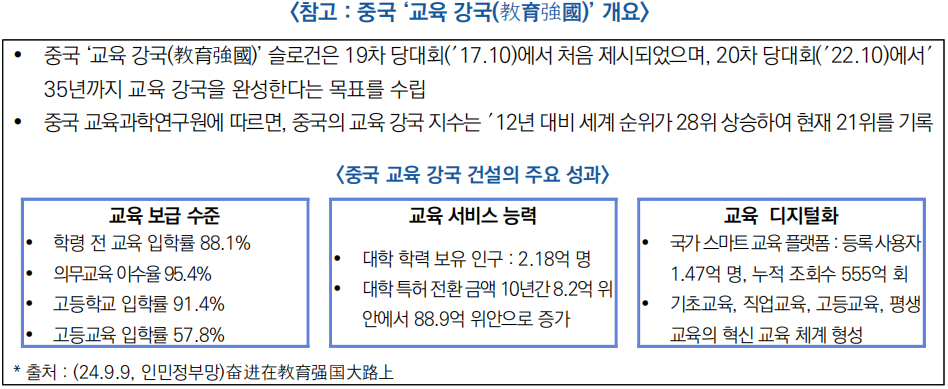 □ 중국 교육부는 ‘14차 5개년 계획(′21~′25년)’ 기간 의무·고등교육 확대, 5,500만 명 인재 배출, 디지털 교육 플랫폼 구축 등 ‘교육 강국 건설’의 핵심 성과를 발표(25.9.23)