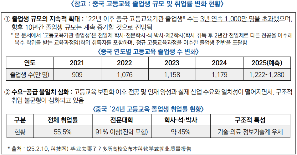 * 2019년 시작된 ‘쌍고(雙高) 계획’은 수준 높은 전문대학을 육성하는 정책이었는데, 2024년부터는 이를 한 단계 업그레이드한 ‘신(新)쌍고 개혁’으로 전환되며, 단순히 학교 시설이나 조건을 잘 갖추는 데서 그치지 않고, 디지털 전환, 국제 협력까지 강화하여 전문교육이 국가 전략과 산업 발전을 직접 뒷받침하도록 한 것임