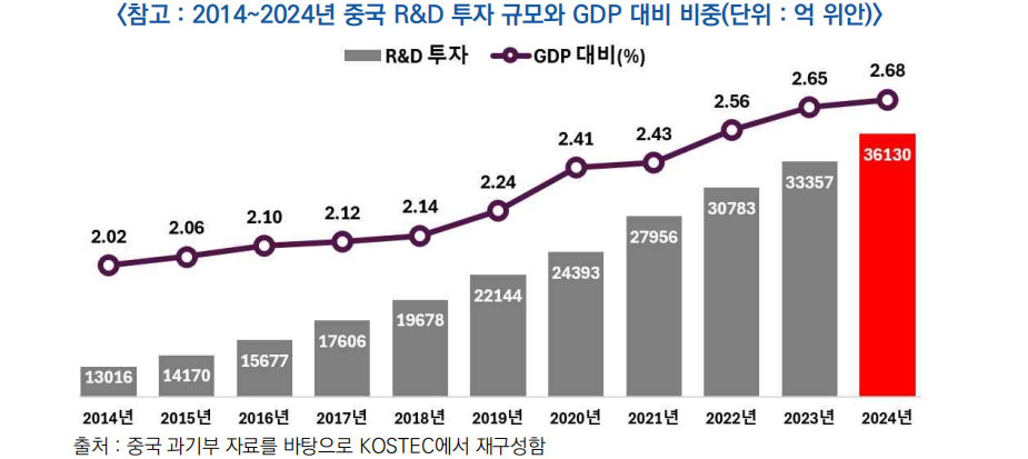 - (R&D 투자) 2024년 전체 R&D 투자액은 약 3.6조 위안(약 704조 원)으로, 2020년 대비 48% 증가했고, GDP 대비 R&D 비중(R&D 집약도)은 2.68%로 EU 평균을 상회했으며, R&D 인력 규모도 세계 1위를 기록함