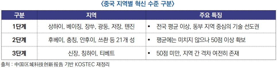 - 장강삼각주(長江三角洲) : 상하이, 장쑤, 저장, 안후이 모두 종합 순위 1~9위권에 포함되며, 기술수입, 기업 R&D 인력, 혁신성과 등 전반에서 우수한 성과 도출