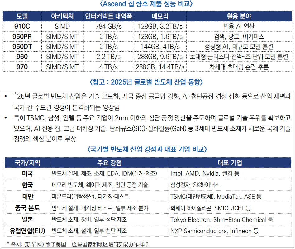 ![]() ○ (Ascend 칩 로드맵) ‘1년 1세대’ 전략을 바탕으로 연산·메모리·대역폭을 단계적으로 확장, 국산 AI 칩의 대안적 경쟁력을 지속 확보