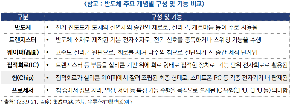 ○ (기술 개요) 반도체, 트랜지스터, 웨이퍼, 집적회로(IC), 칩, 프로세서는 반도체 산업을 구성하는 핵심 개념으로, 각 용어는 소재부터 부품, 기능 단위까지 서로 다른 기술적 단계와 역할을 수행