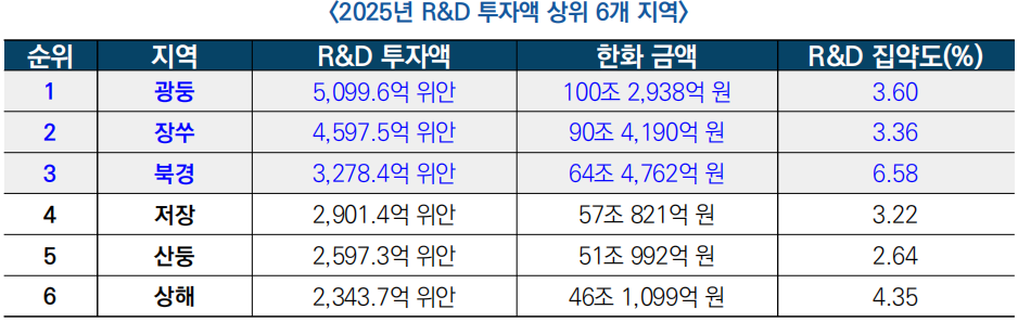 - R&D 집약도가 전국 평균(2.69%) 이상인 지역은 북경(6.58%), 상하이(4.35%), 광둥(3.60%), 톈진(3.44%), 장쑤(3.36%), 저장(3.22%), 안후이(2.76%)로 나타남
