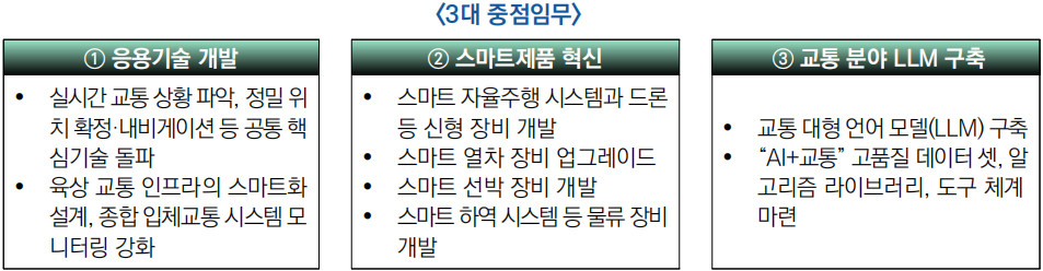 ○ (중점임무) 중국은 ① 응용기술 개발 ② 스마트제품 혁신 ③ 교통 분야 대형 언어 모델(LLM) 구축을 통해 산업 전반을 포괄하는 인공지능 제품 체계를 구축
