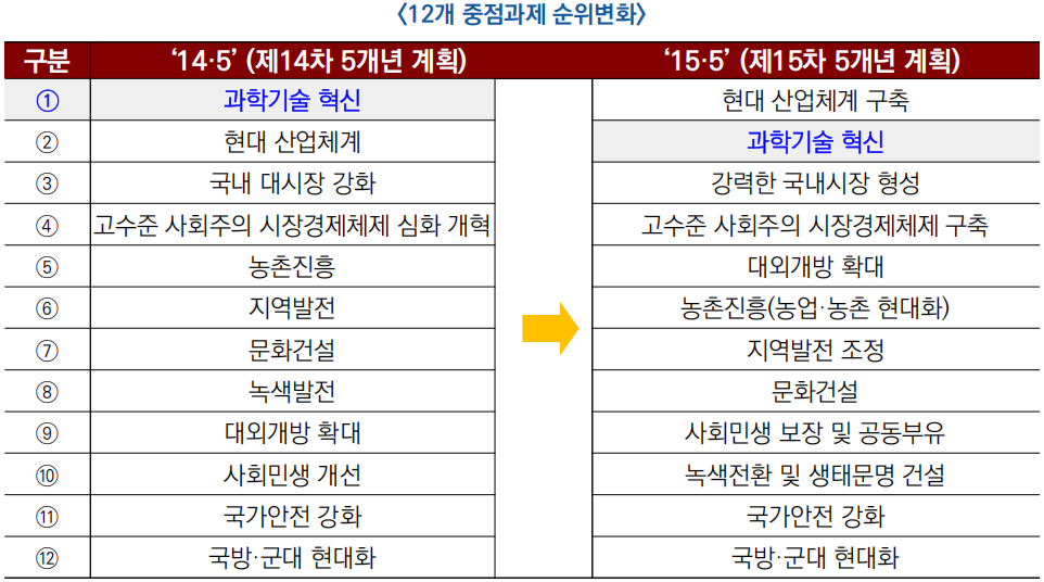 - ‘과학기술 혁신’은 여전히 핵심 과제이지만, 순위가 1위에서 ‘현대 산업체계’ 뒤인 2위로 조정