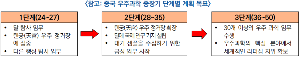 ○ 지난 2024년 10월, 중국과학원(CAS)·국가항천국(CNSA)·중국유인우주공정판공실(CMSEO)은 공동으로 「국가 우주과학 중장기 발전계획(2024~2050)」을 발표하고 중국이 ‘우주 대국에서 우주 강국으로’ 전환하기 위한 3단계 로드맵 제시한 바가 있음