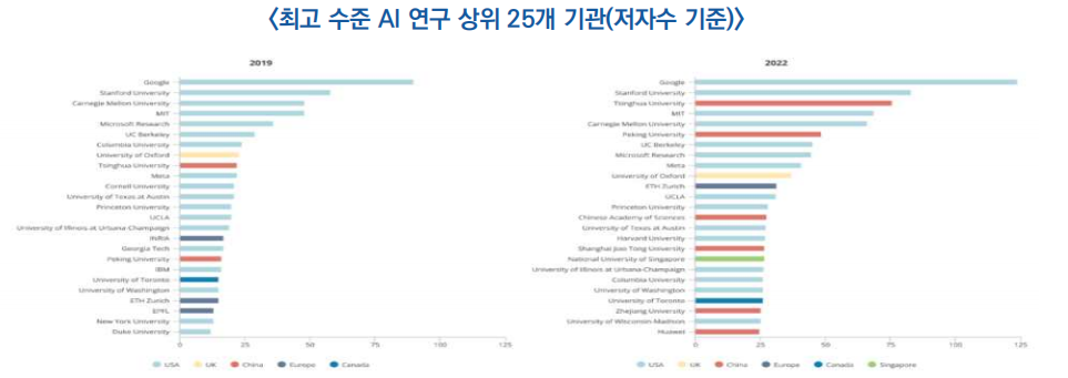 ![]() ○ 최고 수준 AI 연구 상위 25개 기관에서 중국 칭화대, 북경대, 중국과학원 등 6개 기관이 포함