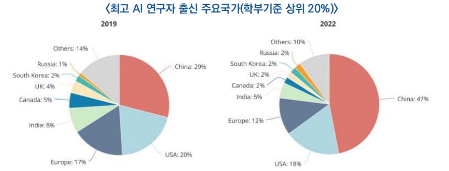 * 미국 시카고 폴슨연구소에 있는 MacroPolo가 실시 “The Global AI Talent Tracker”발표 . 2022년 12월 NeurIPS(신경정보처리시스템) 컨퍼런스에 발표된 2,671개의 논문을 기반으로 분석