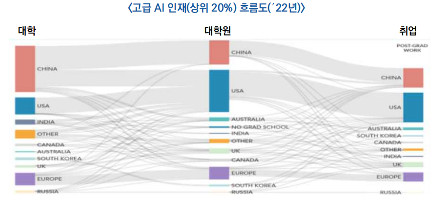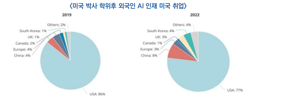 - 대학원 단계에서 중국 AI 인재의 40%가 미국 유학을 떠났고, 그 중 77%가 현지 취업을 선택