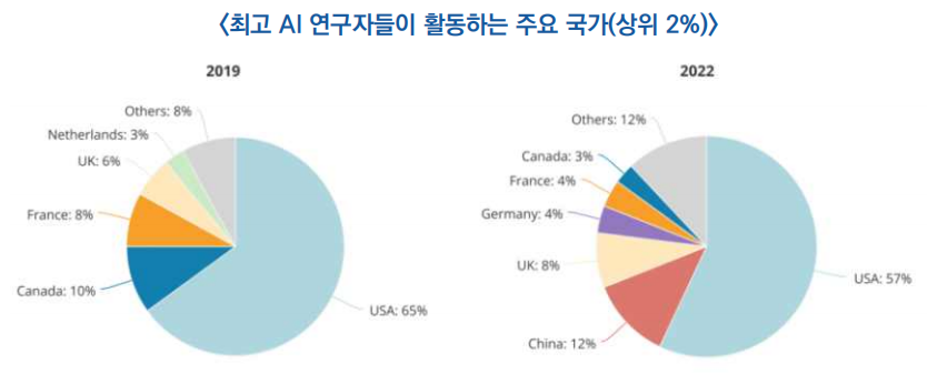 ![]() ○ ′22년 최고 AI 연구자 상위 2% 연구자들의 57%가 미국에서 활동하며, 중국도 12%로 빠르게 부상 중