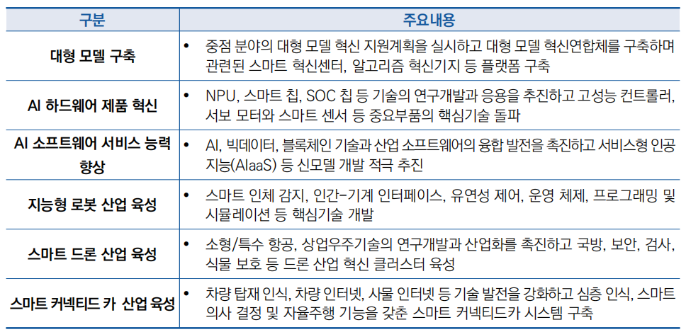 - (′30) AI 산업 600억 위안(약 11조 4천억원) 달성, 국가 영향력을 가진 AI 산업 혁신 클러스터 구축