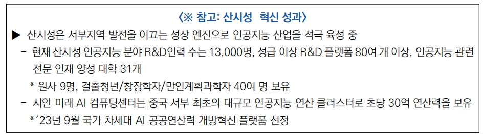 - (연산력 자원) 시안 미래 AI 컴퓨팅 센터, 국가 슈퍼컴퓨팅 시안센터 2기 공정 등 신형 인프라 건설, 동수서산 허브에 산시를 포함, 공공데이터 자원 개방플랫폼 구축