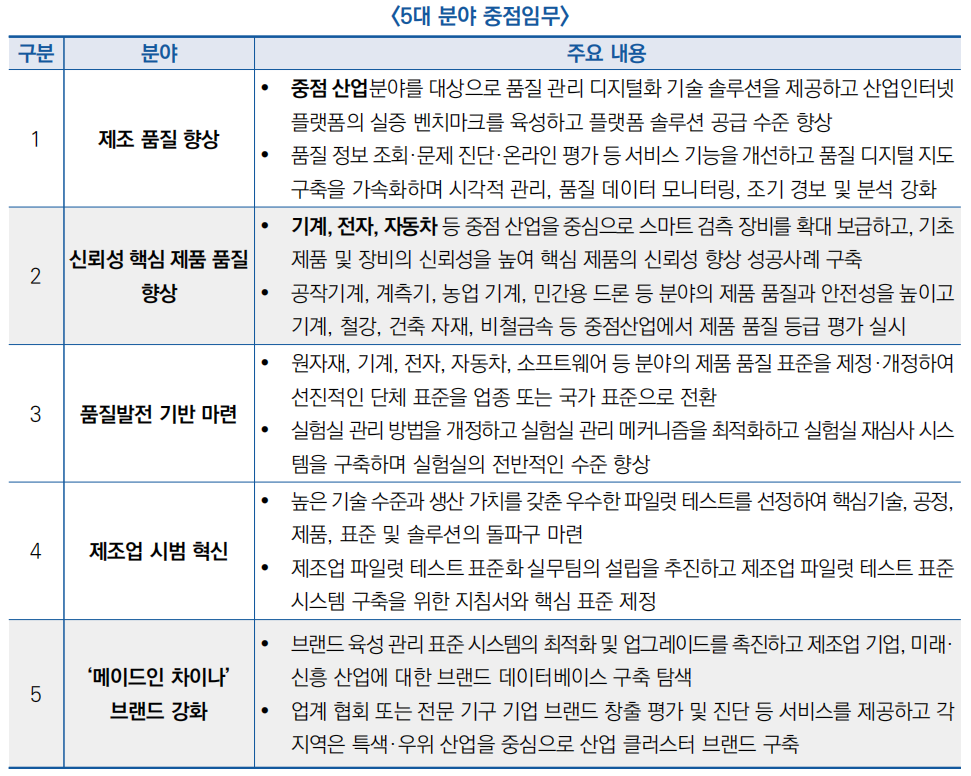 ○ 공업신식화부는 ‘2024년 산업 및 정보 품질 향상에 관한 통지’를 발표하여 제조업 품질 향상, 신뢰성 중심의 제품 품질 향상 등 5대 분야의 중점임무를 제시