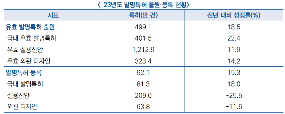 ○ 유효 발명특허 출원은 499.1만 건으로 전년 대비 18.5% 증가했고, 발명특허 등록은 92.1만 건으로 전년 대비 15.3% 상승