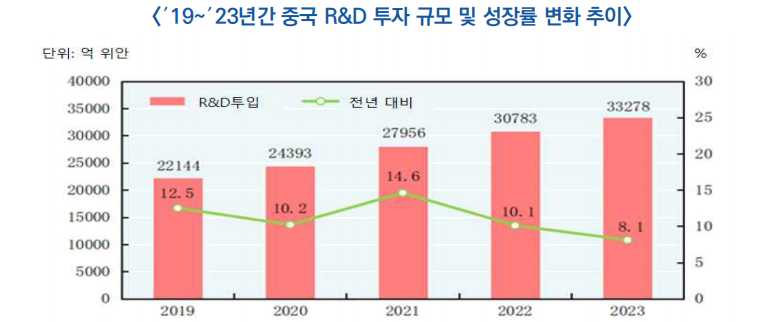 ![]() ○ R&D 투자는 총 33,278억 위안(약 608조 2,885억 원)으로 전년 대비 8.1% 증가했고, GDP 대비 2.64% 차지