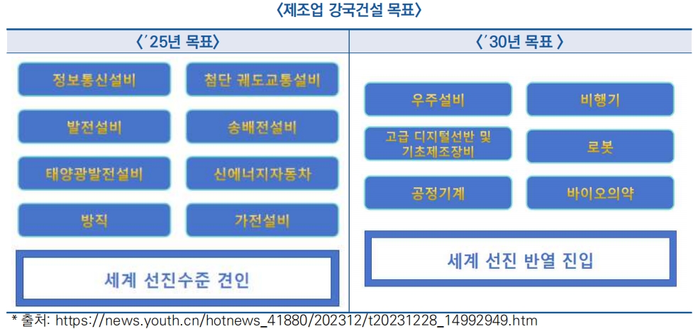 - (목표)′25년까지 정보통신설비·신에너지자동차 등 8대 분야 내 세계 선진수준을 견인하고, ′30년까지 항공우주설비, 로봇 등 분야에서 세계 선진 반열 진입