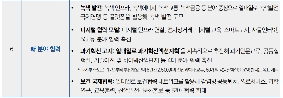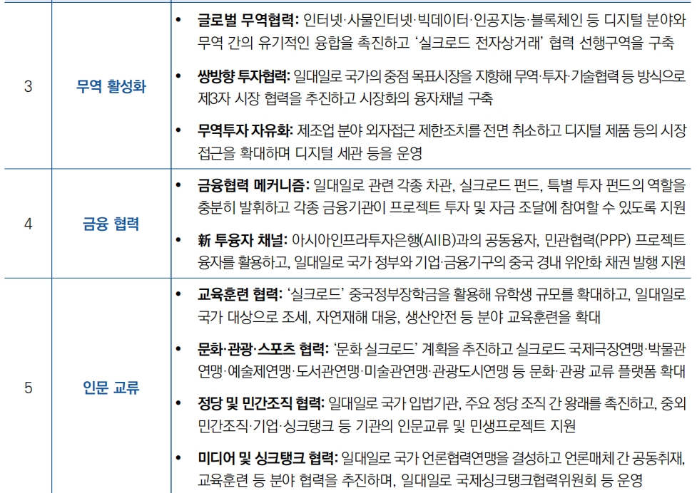 ![]() ○ 주요 과제로 정책 소통, 인프라 연결, 무역 활성화, 금융협력, 인문교류, 新 분야 협력 등 6대 방향 제시