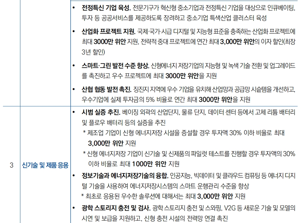 - 신형 에너지저장 기업이 신기술 및 신제품의 응용을 위한 파일럿 테스트를 진행할 경우 투자액의 30% 이하 비율로 프로젝트당 최대 1,000만 위안 지원