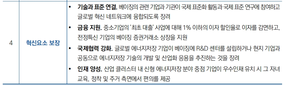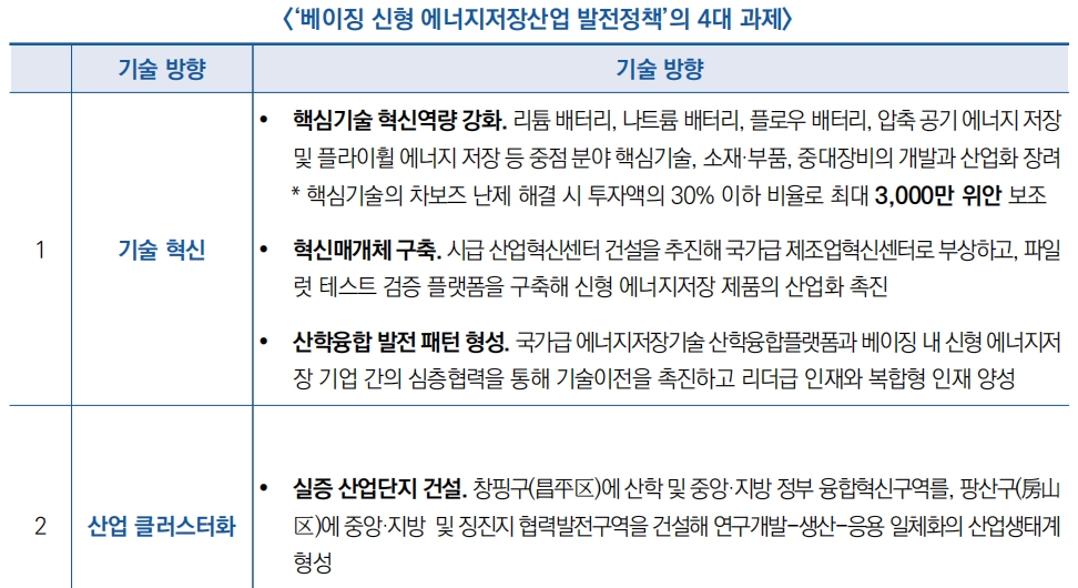 - 주요 목표로 산업발전 우위와 자원우위를 통합해 신형 에너지저장 기술의 혁신과 발전을 촉진하고 베이징의 국제과기혁신센터 건설을 효과적으로 촉진 제시
