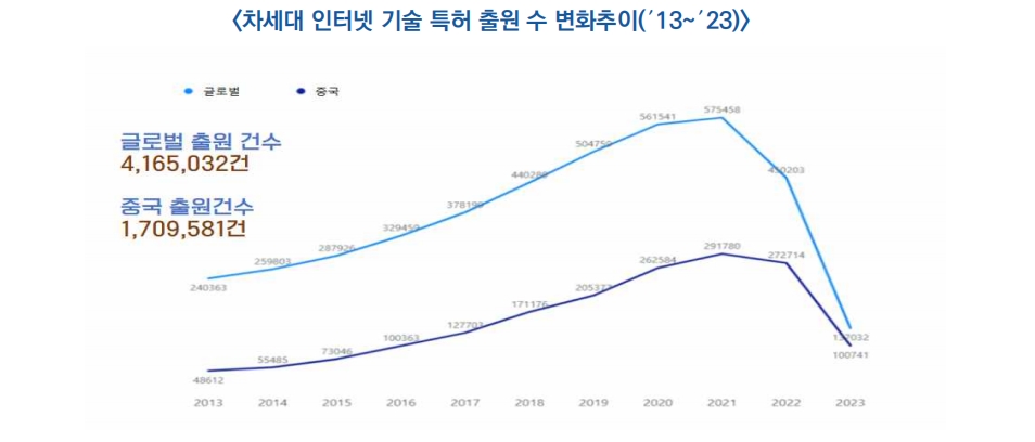 - ′13년부터 ′21년까지 차세대 인터넷 기술에서 중국은 특허 출원 수의 연 평균 성장률이 25.11%에 달했으며 글로벌 연평균 성장률의 2배 이상 수준임