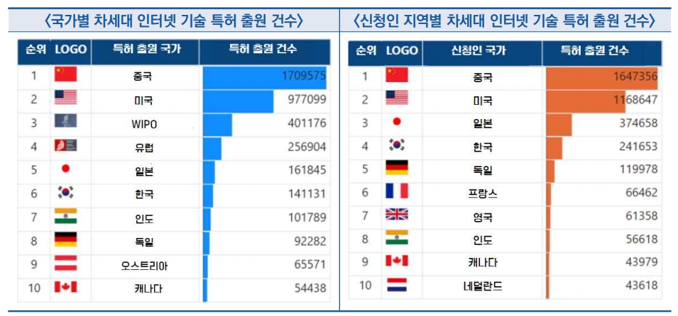 - 차세대 인터넷 기술 특허 신청인 소재지는 주로 중국과 미국이며 중국과 미국에서의 특허 출원 건수는 각각 164.74만 건과 116.86만 건에 달함