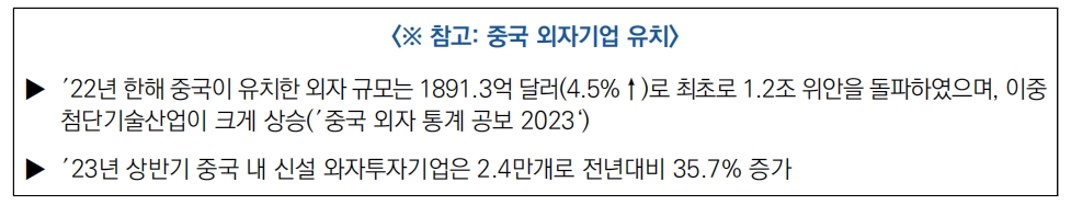 - ′23년 8월 국무원의 ‘외자 투자환경 개선을 통한 외자 유치 확대 의견’에서는 첨단제조, 현대서비스, 디지털경제 등 분야 외자 투자기업 지원 방향 제시
