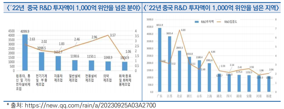 - R&D 투자액이 1,000억 위안을 넘은 지역은 12개 지역으로 광둥성, 장쑤성, 베이징, 저장성, 산둥성, 상하이, 쓰촨성, 후베이성, 쓰촨성, 후난성, 안후이성, 허난성과 푸젠성순임
