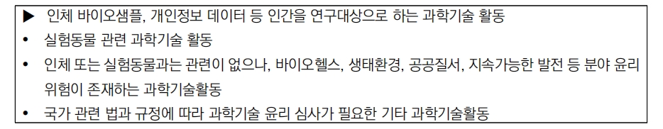 - 특히 생명공학, 의학, 인공지능 등 과학기술활동에 종사하는 기관은 연구내용이 과학기술 윤리 민감 분야의 경우 ‘과학기술윤리(심사)위원회’를 설립할 것을 요구