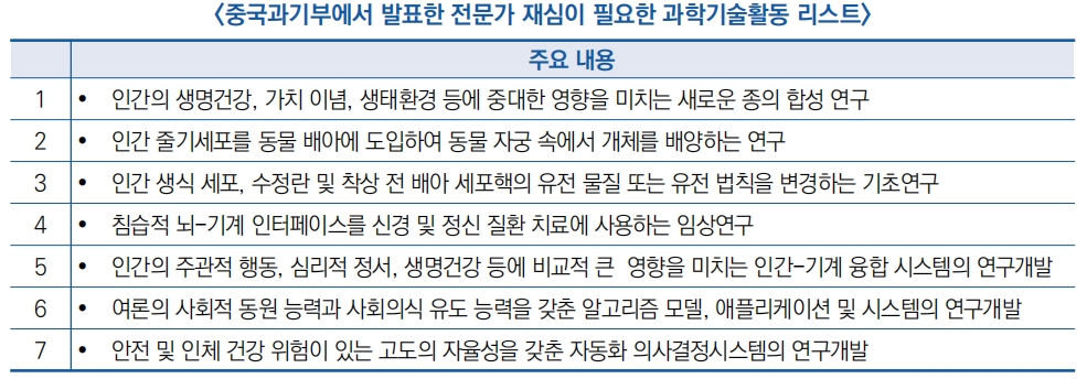 ○ 전문가 재심사가 필요한 과학기술활동 리스트 제도를 도입해 비교적 큰 윤리위험이 있는 신흥 과학기술 활동 관리