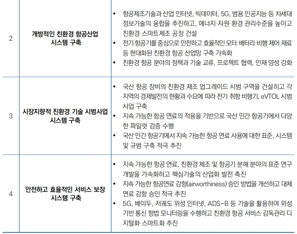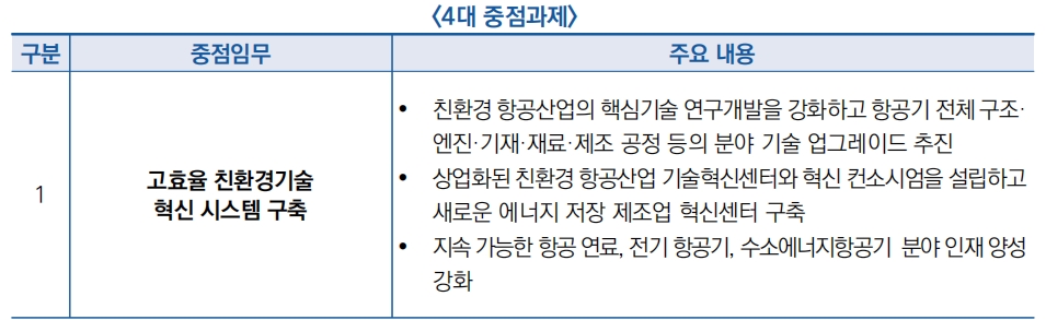 ![]() ○ 주요 내용으로 고효율 친환경기술 혁신 시스템 구축, 개방적인 친환경 항공산업 시스템 구축 등 4대 중점 과제 제시