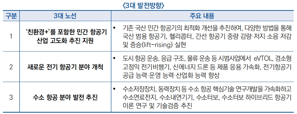 ○ 동 요강은 ‘친환경+’를 포함한 민간 항공기 산업 고도화 추진 지원, 새로운 전기 항공기 분야 개척, 수소 항공 분야 발전 추진 등 3대 발전방향 마련
