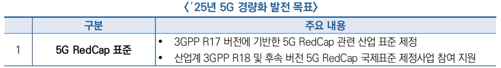 ○ 공업정보화부는 ‘5G 경량화(RedCap) 기술 및 응용 발전 통지’를 발표하고, ′25년까지 산업, 에너지, 물류, 인터넷, 공공안전, 스마트도시 등 5G RedCap 연결 규모 100만급을 초과하는 응용 분야 5개 이상 육성 제시