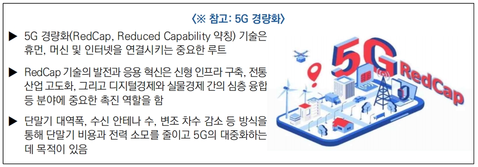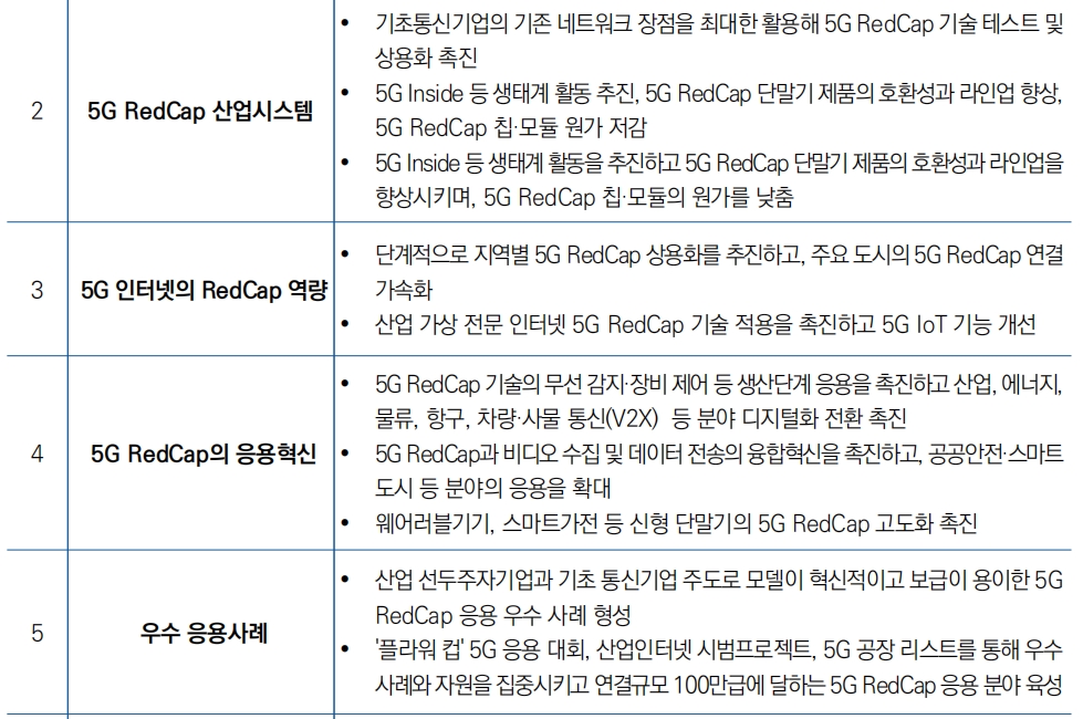 - (기술산업) 5G RedCap 표준을 발전시켜 다양한 응용수요 충족, 칩, 모듈 및 단말 등 핵심 산업망의 원가를 낮추고 100여 종의 단말제품 형성