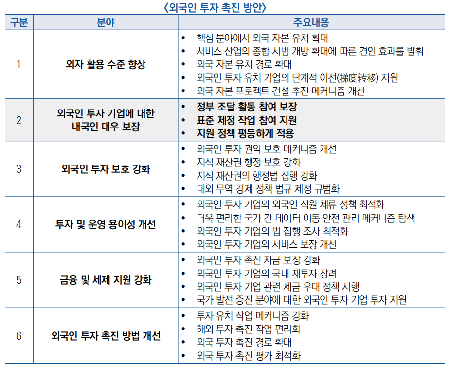 ○ 주요 내용으로 외자 활용 수준 향상, 외국인 투자 기업 내국인 대우 보장, 외국인 투자 보호 강화 등 6대 분야의 24개 조치 제시