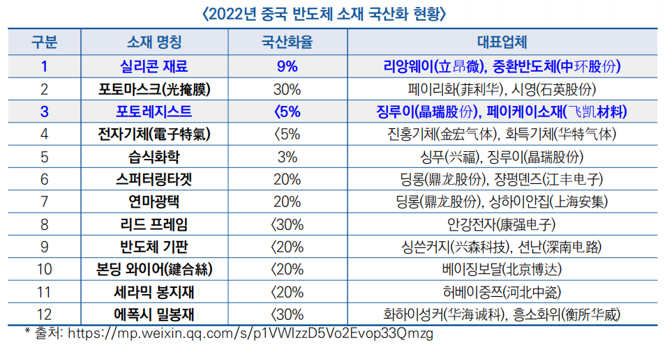 - 현재 중국 반도체 소재의 국산화율은 낮은 편이며 특히 실리콘 재료, 포토레지스트 등 고급 제품의 국산화율은 10% 미만 수준임