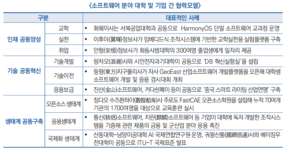 ![]() ○ 중국의 소프트웨어 분야 대학 및 기업 간 협력모델은 인재 공동양성, 기술공동혁신, 생태계 공동구축 등 3개 방향으로 구분